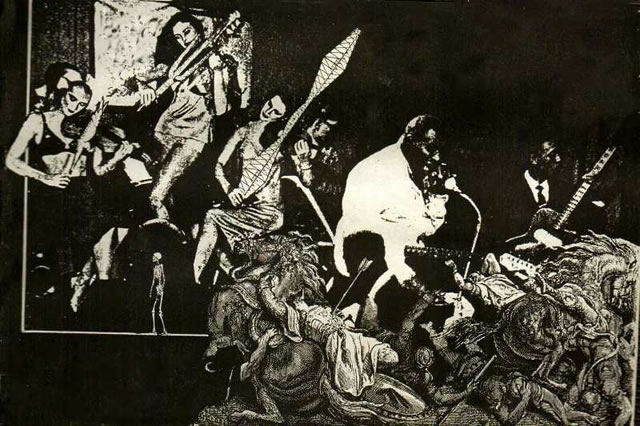 Davey Williams approaches what-we-do-when-we-improvise by indirection and analogy; the book’s non-idiomatic structure and episodic nature, recurring motifs, sudden non-sequiturs, and visual cues that color your reactions, are kith to what he describes. Free play is about the process, the living it in the moment; some chapters are epigrams, flashing by in half a page; the longest chapters run on for all of three pages. They are sequenced less by explicit themes than chains of association. For instance, the idea of referencing existing music in free play (it’s allowed) is echoed, over the course of seven pages/four chapters, by the intrusion of another narrative in a different style (more on that below), and a discussion of the ways sampling culture turns your music into someone else’s – versus the DIY own-your-own-music cassette culture that helped international improvisers find each other in the 1970s.