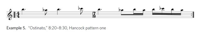The perception of shifting in and out of synch during collective improvisation serves to heighten this effect. There is much rhythmic interplay with Hancock using the steady pulse as a bouncing board to present ever-changing, syncopated chordal patterns. Despite the complex meter, Buster Williams “laid down the ‘Ostinato’ rock solid for the entire duration of the tune.” The steady pulse against which the improvisation pivots was reinforced by the addition of Ndugu Leon Chancler as a second drummer. Percussionist José Chepitó Areas, on congas and timbales, alternately reinforces and pushes against the beat. Chancler, whose Swahili name means “brother, sister, or friend,” recalls how he became involved with this project: “After I played the Inglewood Forum with the band, Herbie invited me to join the band. I didn’t do it since I had a scholarship to college. So Herbie said that since you bailed us out, why don’t you join us on our upcoming recording. Before the session, we never talked conceptually about what two drummers would do. We just started playing. Billy Hart and I just kind of blended for what it was and intervened in between each other. A lot of these guys were used to playing in four and we were doing this thing in fifteen. That was a different twist in itself! For me, I had been dabbling with Don Ellis, who was local; I had played on a few rehearsals and was a fan of his band, so I was familiar with odd times. While I had not yet done a recording session with two drummers before, since I had played avant-garde music during that period, playing with two drummers or percussionists was a familiar idea. We had been playing in a Coltranish kind of vein, but not with Herbie. When two drummers get together, both roles are suppressed a little; James Brown was already doing it; I was coming out of that first. All of it was in conjunction with the groove. The groove was first and foremost. It was just a matter of us getting a swing out of it. It wasn’t that hard. All the guys were there. They had a feel for it; they just took it and ran with it. Man, it was a great experience. I heard the Mwandishi recording when it first came out and I bought it. I dug it. It was mixed extremely well for the number of instruments that were there. There was a lot going on.” Rubinson also recalls the recording sessions: “I remember Ronnie Montrose playing [guitar], and me on my knees working the wah-wah pedal with my hands.” “Ostinato: Suite for Angela” opens with a textural introduction constructed from Echoplexed electric piano figures and angular saxophone lines. Following two seconds of silence, the ostinato itself begins at the half-minute mark. It is initially announced by a tag-team, first by the bass clarinet, then bass, and after that, by the two together, with the addition of congas and flanged drums. Around one minute, Hancock adds Echoplexed electric piano lines, which add another layer of rhythmic complexity. The Echoplex is a tape delay device first sold in the early 1960s. The addition of a moving tape head allowed a performer to shift the length of the delay in real time. Hancock developed a technique that allowed him to use the delay time for its rhythmic possibilities, used to great effect on this tune. At times during “Ostinato,” Hancock complements the delays with electronic pitch shifts. Pitch shifting is a technique we now take for granted on synthesizers, introducing a glide between notes that is impossible on an acoustical keyboard instrument (since there are no notes between the piano keys). But here, the effect is not a simple slide between notes, but a wobbling of the pitches, one part distortion and one part glide. The ostinato continues steadily with each of the musicians adding and subtracting elements into the musical mix. For instance, at a minute and a half, Eddie Henderson plays three-note figures on trumpet, with Julian Priester adding a countermelody on trombone. Soon, the bass clarinet shifts from the ostinato to an oscillating countermelody. Closing in on two minutes, Hancock adds a rising figure on Echoplexed electric piano, which he manipulates live in real time. The overall effect of the countermelodies and counterrhythms is akin to a collective jam that sounds simultaneously free yet, due to the close attention to the ostinato and its variations, discernibly structured. The improvisations that follow feature call-and-response (between Hancock and trumpeter Henderson), multilayered drumming, and Hancock’s periodically generated several-chord ostinati, playing against the bass line or drumming. At various points, the drumming increases in intensity and complexity, heightened in Hart’s case by flanging in postproduction (Chancler’s kit remains unprocessed). Various members of the band periodically join in the ostinato, strengthening its gravitational pull. Hancock’s solo reflects a masterful integration of rhythmic playing and the use of ostinati and tone clusters, heightened by his use of the Echoplex. A detailed description offers a sense of the flavor of this solo. Hancock begins with short phrases played in call-and-response patterns, variously repeated, followed by increases in the Echoplex delay time and insistent repetition of a chordal figure. Between seven and eight minutes the level of intensity builds by Hancock’s use of repeated tone clusters, chords rising up the keyboard, and chordal ostinati, while he explores changes in the repeat time of the Echoplex. After more call-and-response chord patterns, as we approach eight and a half minutes, Hancock plays a distinctive melodic figure. This figure ascends, with increased Echoplex, followed by a new pattern, a chord played low in the electric piano’s register, repeated three times an octave up, and concludes with three quick repetitions of a chord up and down the octave. Hancock’s solo winds down with syncopated multiple-chord patterns before joining in the o