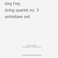 “Unhörbare Zeit” (inaudible times) adds two percussionists to the mx and here the structure opens up even more. The durations of silence are as central to the piece as the sounds of strings and the low rumbles of percussion. Frey states that he is working with “audible and inaudible durations that appear partly simultaneously and partly consecutively. They give the piece lucidity and transparency, as well as materiality and solidity.” While silence as a structural element has been fully absorbed into the vocabulary of contemporary composition, it is the way that Frey gives the silences weight and dimension within this piece that really stands out. The balance of the timbre of strings, low register percussion, the rustle of room sounds and the mercurial pacing of sound and silence is fully entrancing.