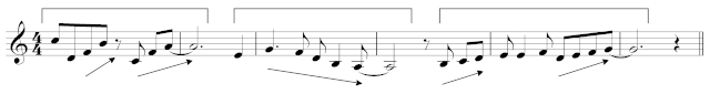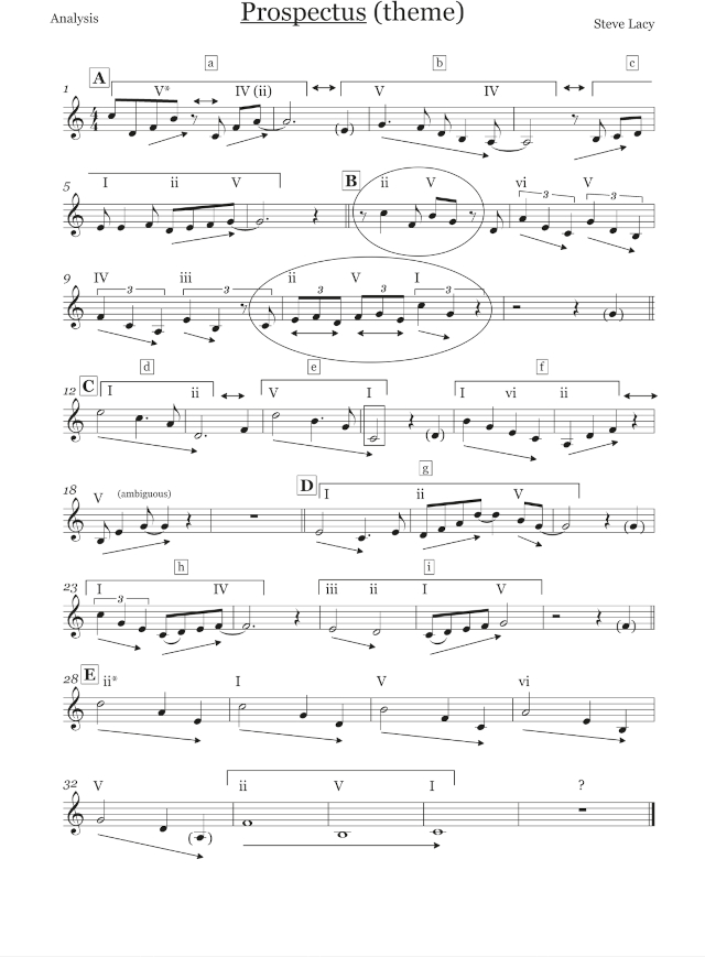 The tune has a couple of other peculiarities that I’d like to mention before I begin my formal analysis. I) When I say that the tune “Prospectus” is entirely diatonic, I am excluding the 8 bars which frame any performance / recording, just outside the head / improvisation / head structure. This single repeated phrase, which consists of three (almost) identical chromatic sequences moving up in minor thirds (followed by a button at the end) which is repeated four times, seems to bear little in common with the tune itself–except that it does. With its flats and sharps and angular shape it appears to be a classic Lacy / Monk-style jazz riff, emphasizing the Lacy-esque arithmetical exploration of transposition: the only similarity to the main tune is the use of parallel phrase shapes. But its very existence throws out the challenge: here is the type of music I write: let’s see what happens if I take away all of the accidentals: will it still retain its essential character? II) Letter E, the final nine-bar section, consists of a series of identically-shaped phrases, moving through a pattern of fourths, in the form of a half note followed by two quarter notes. However, despite the fact that this is one of Lacy’s most oft-performed tunes, he has never once played this section in the rhythm as notated by himself. Instead, he favours a sequence of two dotted quarter notes followed by a quarter (or a series of three half note triplets, depending upon your interpretation). Yet, when questioned about this discrepancy by singing students in his class at New England Conservatory of Music, Lacy insisted the notated rhythm was the correct one.[10] I leave this enigma for the reader to ponder. III) Lacy is fond, in his notation of his tunes, of writing the accompaniment in the bass clef of the grand staff as a series of tone clusters. He does this in the case of “Prospectus,” the only difference from a traditional Henry Cowell-style tone cluster being that they utilise only notes from the diatonic key of C, tones mostly separated by a major second, for example, a cluster chord consisting of C, D, F & G. Like the relationship between intro and the tune, it’s as though you took a more conventional tone cluster and sucked all the chromaticism out of it. However, in practice, this part is rarely played. Instead, pianist Bobby Few accompanies it freely with a combination of McCoy Tyner-esque modal comping and playing snatches of the melody, always with tasteful inventiveness and imagination. I mention these three details as an ‘intro’ to this article because my analysis does not have the satisfying directionality of a tonic / dominant resolution. My only wish is to take “Prospectus,” examine its details, and turn it this way and that in the sun, (to ‘mull’ it over).