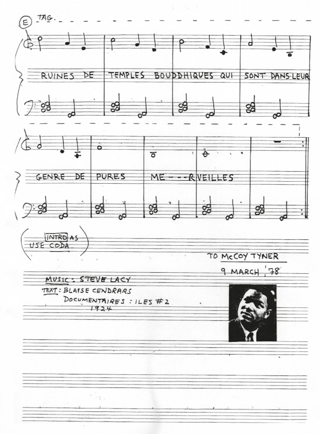 The Book Cooks Steve Lacy (Unfinished) The revolutionary conservatism of Steve Lacy’s “Prospectus” ![]() Steve Lacy Sextet: postcard included with Prospectus (hatART) © Horace There is still plenty of good music to be written in C major. Lacy’s Lines Steve Lacy’s tunes form one of the most unique bodies of work in jazz, and in contemporary music. Very clearly influenced by Thelonious Monk’s tunes, Lacy’s have a unique and immediately recognizable sound. Like Monk’s, they are angular, chromatic, strongly motivic and reflect a wry sense of humor. However, unlike Monk’s tunes, which still maintain roots in the language of bebop (no matter how tenuous) and follow song-like harmonic structures (often using blues and rhythm changes, but also featuring notable departures featuring strings of obscurely-related dominant seventh chords), Lacy’s tunes seem to be almost more closely derived from Monk’s solos, often taking a specific motivic idea and deeply, almost obsessively, examining it, turning it this way and that in the light, to examine particular melodic, harmonic and rhythmic facets. One element that he was particularly fascinated by was intervals. It may be that periodic long periods of unemployment made Lacy a world-class practicer, and he often used the word practitioner rather than musician to describe his role. One sometimes inadvertent result of sustained practicing is that the beauty of scales, arpeggios and long tones is revealed, and systematic patterns of intervals become melodies in themselves. Lacy made the creation of unpredictable patterns of intervals into a compositional (and improvising) language. Listen to bars 5-9 of his second solo chorus on Cole Porter’s “Easy To Love” on his Prestige recording Soprano Sax, one of his earliest recordings as a leader, and you can already see ‘evidence’ of his fascination with small changes in intervals and patterns. ![]() Fig. 1 bars 5-9 of the second chorus of Lacy’s solo on “Easy To Love”[1] Chromaticism in jazz Early jazz was largely diatonic, the most chromatic element being the injection of the blues scale over dominant seventh chords, with diatonic harmony favoured.[2] The voice-leading of the ‘Great American Songbook’, with its succession of ii V I chord sequences, built upon and expanded it, and the bebop era ear offered much more chromatic lines, featuring notes drawn from the upper extensions of the harmony (-9, +9, +11s etc.), over mostly standard harmonic structures. Later developments of post-bop, Wayne Shorter, modalism, brought both simpler and more complex harmony, and the free jazz of Ornette Coleman and late John Coltrane eventually abandoned the repetition of harmonic structures as a formal device. Like classical music, the history of jazz can be traced as a journey from simpler melodic, harmonic and rhythmic conventions, to ever-more complex ones, to the abandonment of these rules, to aleatory or improvised music worlds. Of course, this death march from tonality to atonality finished decades ago, and where to from there? Much of the subsequent forward motion has involved going back and more closely examining previously neglected side-paths or juxtapositions, and in a 1980 interview with Lee Jeske in Downbeat[3], Lacy referred to his music as ‘post-free’ or ‘poly-free’. Which brings us to “Prospectus.” Prospectus “Prospectus” was composed in 1978 in Paris and was first published in a collection of scores of the same name by Gunther Schuller’s Margun Music in 1987. While not mentioned in the published score, in Lacy’s hand-written chart it is dedicated to McCoy Tyner.[4] Like many of Lacy’s ‘songs’ it has a lyric, that was often sung by his creative and life partner Irene Aebi, based on a poem by French modernist poet Blaise Cendrars. Lacy explains in the introduction to the Margun edition (‘About The Music’) that, “The poet, Blaise Cendrars, found this text in a travel brochure in the ‘20s, gave it shape, and called it a poem. Years later I set it to music and now it’s a song ... the whole piece should be light and gay, off the ground.”[5] In Steve Futterman’s liner notes for the 1992 Novus recording Live at Sweet Basil, he says that the tune had been the band’s opening number for about 14 years. He quotes Lacy as saying, “It’s an invitation to a voyage, that’s why we start with it. It’s also a tune in C major, every note in it. It’s good for opening up, for tuning up, for breaking the ice, for letting the public hear our sound.”[6] The tune was played often by Lacy throughout his career in multitudinous formations: solo, various duos, quintet, sextet, both with and without the lyric. It was clearly a favorite. Prelude to the analysis The tune consists of a 36-bar melody, with an 8-bar introduction which is also played after the out-chorus as a coda. (There is a one-bar drum break separating the introduction from the in-chorus). The tune itself has no formal structural divisions, such as a 12-bar blues does, or a 32-bar AABA form common in jazz. There are rehearsal marks in the original Margun Music score, dividing the tune into five sections of 6, 5, 8, 8, and 9 bars respectively, and these are quite logical divisions based on the melodic development of the tune. However, none of them repeat, and this structure is not used as a form for improvisation. The end result is that “Prospectus” is a 36-bar jazz tune in which no single bar is ever repeated. And at no point in the tune does it even once depart from the diatonic key of C: that is to say, it can be played entirely on the white keys of the piano. However, there are a number of other ways in which the tune itself is both accessible and inviting. As mentioned, it is in a major key; it begins and ends on the tonic. While there are no chord changes per se, horizontally there are many moments of pretty conventional harmony implied, including ii V I’s, and I IV V’s. 