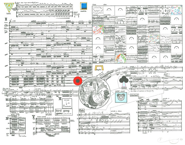 Bird Gong Game ![]() Excerpt from Bird Gong Game ©Barry Guy In 1991, when the artist/musician Alan Davie requested a piece that would involve him as a solo pianist without a written part (i.e. freely improvising) performing with a “straight” classically trained ensemble, my immediate reaction was that this scenario might represent an unstable chemistry. The piece was destined to be part of a concert to conclude a major retrospective of Davie’s work at the McLellan Galleries in Glasgow. Since my previous meeting with Alan Davie in an improvising context was fifteen years before, I had no idea how he would play the piano. First thoughts related to ensemble management where wide musical parameters had to be accessed quickly with the choices being conveyed to the players in an efficient manner. Clearly, a through-composed score would not suffice, so I pursued the idea of a single page of music that offered a tapestry of tight formations through to total flexibility via a series of “hierarchies” that could be modified during the performance by means of hand signals and flash cards according to the perceived progress of the piano soloist. This set-up would form a three-way conversation – soloist, director and ensemble in a flexible scenario of give and take. The title of this graphic score refers to one of the series of Alan’s paintings called Bird Gong, executed during 1973. My chosen painting was Bird Gong No.12, and I perceived the piece to be a kind of game, a juggling of elements always in flux and instantly changeable, at times matching the soloist or offering new strategies at appropriate points during the performance. Flash cards shown to the performers consist of various symbols which are derived from Alan Davie’s painting, so in a way I deconstructed Davie’s sign language to offer aural equivalents of his work – purely subjective of course. The important aspect for me was finding a way of formulating a performance method that would be sufficiently flexible so as to allow all participants a musical landscape that was colorful and reflective of their combined talents without recourse to over complicated matrixes of possibilities and probabilities. In other words, I was searching for a solution that would bring together two quite specific and often opposing musical disciplines that would complement each other and even enhance the various characteristics that define their differences. The flash cards symbols which appear on the score and parts are as follows: Tutti; with six possibilities ranging from through-composed sections to single gestures. The flash card plus the selected module number (shown by finger signs) identifies the musical area. Solo; three woodwind solos can exist by themselves or as a foil to the improvising soloist, or if so desired be used together as a group. The music is flexible in the sense that the individual players are presented with two kinds of material – legato and staccato, with three fragments under each heading that can be assembled in a spontaneous way during the performance. Mobile; this is a matrix of mainly graphic suggestions where four players (percussion, flute, oboe, clarinet) select various options, traversing the material in either horizontal, vertical or diagonal directions. Tam Tam; this symbol sits centrally in the score which designates its importance within the piece – a midway semi-improvisational explosion of percussive activity engaging the soloist in an active exchange of material. This section is introduced and terminated by the trumpet. Sustained; as the title suggests, this refers to sustained material with five options from very quiet to very loud. The material differs considerably in tessatura between the five possibilities. Wild Card; this invites the player(s) to assess the soloist’s playing manner and improvise freely with or against the prevailing musical gestures. Maybe; a kind of joke. Should my bass be on hand, “may be” I could join in with the performance, but in practice I have only ever managed this once with violinist Patricia Kopatchinskaja as the improvising soloist. Since the premiere of Bird Gong Game in 1992, the piece has been performed numerous times with a wide variety of improvising soloists including a.o. Evan Parker (soprano saxophone), Maggie Nicols (voice), Mats Gustafsson (baritone saxophone), Ivo Nilsson (trombone), Georg Grawe (piano), Agustí Fernández (piano) and Peter Van Bergen (tenor saxophone and contrabass clarinet). This lengthy exposition is here to explain the methodology not only of Bird Gong Game but also of subsequent scores although each project was fashioned according to the ensemble or soloists’ brief, and source material has been derived from texts and architecture as well as paintings.