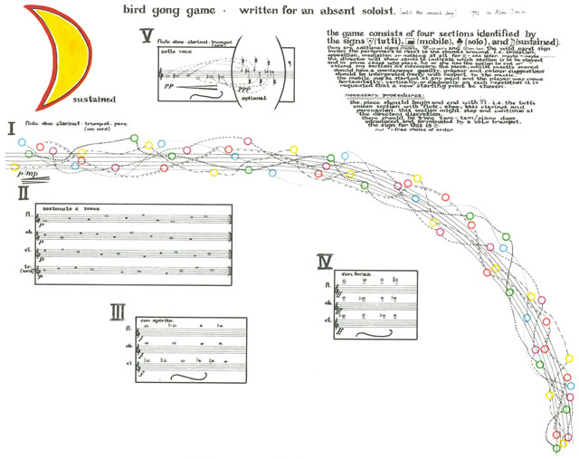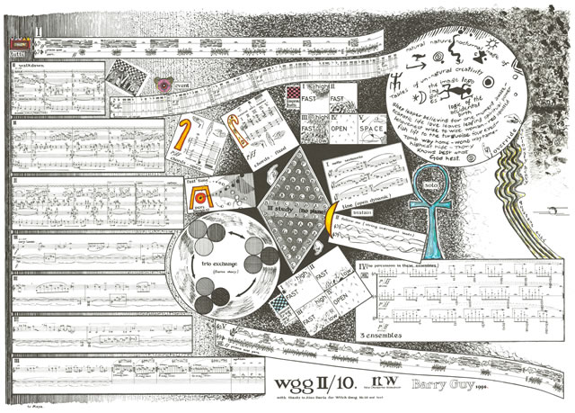 by ![]() Excerpt from Bird Gong Game ©Barry Guy A French translation of this essay was originally published in l’art du jazz (2011; Éditions du Félin). Since 1992 I have, as part of my compositional output, been involved with graphic scores of one sort or another, although way back in 1968 I recall putting a piece together entitled Dada Requiem at the Guildhall School of Music and Drama in London where my musical studies took place. Basically it was an excuse to be a bad boy and a (successful) chance to utilize different departments within the college to wrap up the audience and professors in paper as part of a multifaceted performance/happening. It was instructive for me if not for them. The score consisted of one page of theatre plans plus choreographic moves and musical events which in a way presaged my subsequent graphic activities. Twenty three years later a new initiative was born with the encouragement of Scottish painter/musician Alan Davie. From those early days my musical activities tended to be well defined – improvisation, historic performance practice, contemporary music (solo and ensemble) and composition. The first and last of these areas came together as an entity (mainly) in the scores written for the London Jazz Composers Orchestra (LJCO) and latter for the Barry Guy New Orchestra (BGNO). These scores were characterized by my utilizing the creative improvisational voice within defined (and sometimes not so defined) structures that allowed freedom as well as finite through-composed sonorities. The important element was that improvising musicians formed the ensemble and gave it its specific sound. Simple graphic representations of sound areas informed the players of sonic expectations, but I also used more conventional symbols which continuously changed over the years in an attempt to refine not only the clarity of intention but also the ease with which they could be interpreted. From the first days when the LJCO battled heroically to decode Ode (1970-72), which used mainly time-space notation plus a conductor (my composition professor Buxton Orr), through to today – Radio Rondo (2008) for the LJCO and BGNO pits a piano soloist against a distinctly reductive (although at times still complex) ensemble score – the prime objective has been to integrate free improvisation (provided by improvisers) with composition. In contrast to this area of activity, my compositional desires followed a more conventional route where through-composed music for interpreters such as orchestras, chamber ensembles and soloists avoided any semblance of improvisatory procedures.
