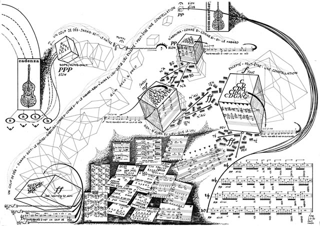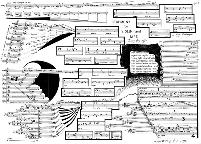 Graphic Scores after Bird Gong Game ![]() Excerpt from Witch Gong Game ll/l0 ©Barry Guy Once the musical parameters are established, I take a great deal of care and time not only to show the necessary musical strategies, but also to graphically give some representation of the project’s background. For instance in Witch Gong Game II/10 (1993) written for the New Orchestras Workshop Vancouver, the positioning of the various modules over a black void, suggested the fragility of co-operative ventures where individuals working for the collective might, in certain circumstances, destabilize the infrastructure with implosion as the end result. ![]() Excerpt from Un Coup de Dès ©Barry Guy In Un Coup de Dès for the Hilliard Ensemble, the frozen motion of a turning dice exposing faces of pitches to be sung were laid out according to an extrapolation of a möbius loop idea for a high rise crystalline building by U.S. architect Peter Eisenman (destined for Berlin but unbuilt). Another inspiration for the final layout was the Japanese project (Tomiguya Exhibition Space) by the English architectural practice Richard Rogers partnership (also unbuilt) which featured in its design various movable modules within the structure all held up by what appeared to be a huge tower crane. In this instance I was entranced by the idea of a structural finality that was fixed but also flexible. After several research drawings the layout was completed, showing a practical routing for the vocalists but also representing the general musical direction. It starts and ends with similar material and vocal color but contorts like the möbius loop, reflecting the architectonic pyrotechnics of the Richard Rogers project. ![]() Excerpt from Ceremony ©Barry Guy In Ceremony written for the baroque violinist Maya Homburger, her request for a meditational as well as virtuosic piece, led me to choose a Navajo Indian chant as the starting point. I first discovered the text in an exhibition by the artist Cornelia von Mengershausen. It accompanied an installation of a spiral floor sculpture with ever changing textures (sand, leaves, stones, moss, etc.) which the visitor was invited to experience by walking over it with bare feet. The walking idea was incorporated into the score and the layout was formulated to suggest a constantly evolving landscape terminating in a final “processional” of quietness and contemplation. Since Bird Gong Game, I created over twenty more scores with various degrees of freedom and improvisation. Each score has found its own resolution according to the extant parameters and within these I have worked towards expressing a solid musical argument as well as presenting aspects of the background in a graphic way. But the overriding principal has been, to present the material in a concise, clear and practical way for the musicians. Developing these graphic scores has in a way fulfilled schoolboy ambitions to be an artist and has utilized my skills, gained later whilst working for an architectural practice in my formative years. Combining these creative impulses with music has given me immense pleasure, opening up an internal narrative about the relationship between the aural and visual and deepened the inventive process itself. [For more information about limited edition screen prints of Bird Gong Game and WGGll/l0, consult: www.maya-recordings.com] © Barry Guy 2012 |