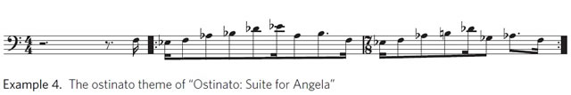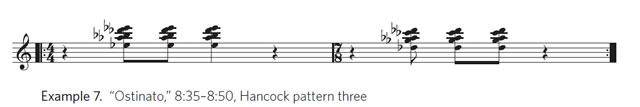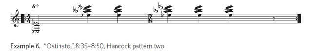 The perception of shifting in and out of synch during collective improvisation serves to heighten this effect. There is much rhythmic interplay with Hancock using the steady pulse as a bouncing board to present ever-changing, syncopated chordal patterns. Despite the complex meter, Buster Williams “laid down the ‘Ostinato’ rock solid for the entire duration of the tune.” The steady pulse against which the improvisation pivots was reinforced by the addition of Ndugu Leon Chancler as a second drummer. Percussionist José Chepitó Areas, on congas and timbales, alternately reinforces and pushes against the beat. Chancler, whose Swahili name means “brother, sister, or friend,” recalls how he became involved with this project: “After I played the Inglewood Forum with the band, Herbie invited me to join the band. I didn’t do it since I had a scholarship to college. So Herbie said that since you bailed us out, why don’t you join us on our upcoming recording. Before the session, we never talked conceptually about what two drummers would do. We just started playing. Billy Hart and I just kind of blended for what it was and intervened in between each other. A lot of these guys were used to playing in four and we were doing this thing in fifteen. That was a different twist in itself! For me, I had been dabbling with Don Ellis, who was local; I had played on a few rehearsals and was a fan of his band, so I was familiar with odd times. While I had not yet done a recording session with two drummers before, since I had played avant-garde music during that period, playing with two drummers or percussionists was a familiar idea. We had been playing in a Coltranish kind of vein, but not with Herbie. When two drummers get together, both roles are suppressed a little; James Brown was already doing it; I was coming out of that first. All of it was in conjunction with the groove. The groove was first and foremost. It was just a matter of us getting a swing out of it. It wasn’t that hard. All the guys were there. They had a feel for it; they just took it and ran with it. Man, it was a great experience. I heard the Mwandishi recording when it first came out and I bought it. I dug it. It was mixed extremely well for the number of instruments that were there. There was a lot going on.” Rubinson also recalls the recording sessions: “I remember Ronnie Montrose playing [guitar], and me on my knees working the wah-wah pedal with my hands.” “Ostinato: Suite for Angela” opens with a textural introduction constructed from Echoplexed electric piano figures and angular saxophone lines. Following two seconds of silence, the ostinato itself begins at the half-minute mark. It is initially announced by a tag-team, first by the bass clarinet, then bass, and after that, by the two together, with the addition of congas and flanged drums. Around one minute, Hancock adds Echoplexed electric piano lines, which add another layer of rhythmic complexity. The Echoplex is a tape delay device first sold in the early 1960s. The addition of a moving tape head allowed a performer to shift the length of the delay in real time. Hancock developed a technique that allowed him to use the delay time for its rhythmic possibilities, used to great effect on this tune. At times during “Ostinato,” Hancock complements the delays with electronic pitch shifts. Pitch shifting is a technique we now take for granted on synthesizers, introducing a glide between notes that is impossible on an acoustical keyboard instrument (since there are no notes between the piano keys). But here, the effect is not a simple slide between notes, but a wobbling of the pitches, one part distortion and one part glide. The ostinato continues steadily with each of the musicians adding and subtracting elements into the musical mix. For instance, at a minute and a half, Eddie Henderson plays three-note figures on trumpet, with Julian Priester adding a countermelody on trombone. Soon, the bass clarinet shifts from the ostinato to an oscillating countermelody. Closing in on two minutes, Hancock adds a rising figure on Echoplexed electric piano, which he manipulates live in real time. The overall effect of the countermelodies and counterrhythms is akin to a collective jam that sounds simultaneously free yet, due to the close attention to the ostinato and its variations, discernibly structured. The improvisations that follow feature call-and-response (between Hancock and trumpeter Henderson), multilayered drumming, and Hancock’s periodically generated several-chord ostinati, playing against the bass line or drumming. At various points, the drumming increases in intensity and complexity, heightened in Hart’s case by flanging in postproduction (Chancler’s kit remains unprocessed). Various members of the band periodically join in the ostinato, strengthening its gravitational pull. Hancock’s solo reflects a masterful integration of rhythmic playing and the use of ostinati and tone clusters, heightened by his use of the Echoplex. A detailed description offers a sense of the flavor of this solo. Hancock begins with short phrases played in call-and-response patterns, variously repeated, followed by increases in the Echoplex delay time and insistent repetition of a chordal figure. Between seven and eight minutes the level of intensity builds by Hancock’s use of repeated tone clusters, chords rising up the keyboard, and chordal ostinati, while he explores changes in the repeat time of the Echoplex. After more call-and-response chord patterns, as we approach eight and a half minutes, Hancock plays a distinctive melodic figure. This figure ascends, with increased Echoplex, followed by a new pattern, a chord played low in the electric piano’s register, repeated three times an octave up, and concludes with three quick repetitions of a chord up and down the octave. Hancock’s solo winds down with syncopated multiple-chord patterns before joining in the o