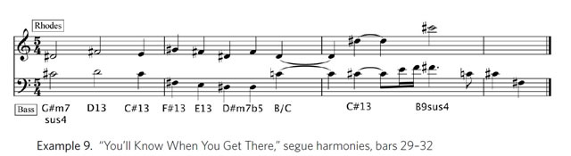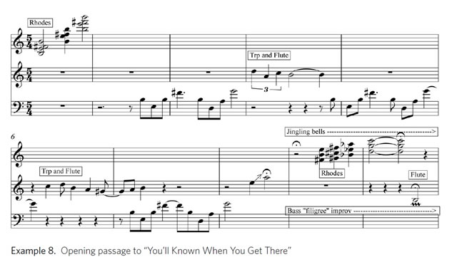 Next, Bennie Maupin offers his atonal and segmented solo over Hancock’s syncopated, rhythmically accented comping, with Hart’s drumming picking up intensity, around eleven and half minutes. This is heightened by the addition of more flanging in postproduction. Once again, Maupin returns to the ostinato, soon joined by Hancock and the rhythm section. Hancock’s solo phrases alternate with drum flourishes and some conga, as Hancock repeats patterns that expand and shift in his comping. As the ostinato continues on the bass and bass clarinet, Hancock varies the patterns of notes and chords he plays, leaving space between sets of chords. The tune ends shortly after thirteen minutes, Hancock having rejoined the ostinato ensemble. The overall effect is an exhilarating display of collective improvisation that is all at once rhythmically solid yet complex and multiterraced, abstract – and – what we’ll term “funky.” As we will see in chapter 7, “funky” is not a strictly musical word, referring more broadly to a celebratory attitude toward life coupled with a joyful loosening of inhibition. But most relevant to the present description of Hancock’s playing, it is useful to speak in strictly musical terms. Within hard bop, “funky” refers to a syncopated music that pushes against the beat, sometimes anticipating and on other occasions following it. Horace Silver’s tune “Filthy McNasty” (1961) captures both the musical and extra-musical sides of the term “funky.” During the late 1960s, a new musical dance form emerged in which the groove was central. The rhythmic emphasis was on the downbeat, as opposed to the practice in rhythm and blues as well as idiomatic jazz, where accents land on the second and fourth beats. The bass plays a leading role in creating the groove, joined by other instruments, each creating its own distinct syncopated rhythm. Together these interlock, forming a rhythmically complex whole that anticipates, comments on, and prepares the arrival of the downbeat. In his solos on “Ostinato,” and from that point forth within the music of the Mwandishi band, Hancock comps by creating syncopated rhythmic/melodic patterns (ostinati) that dance around and about the pulse, forming an integral element within the band’s chain of interlocking beats. The more that Hancock’s figures anticipate and ornament the beat with syncopation, the funkier his playing becomes. Borrowing a practice developed by rock, R&B, and funk guitarists, Hancock routed his Fender Rhodes through a wah-wah pedal that, when toggled, emphasizes different frequencies, heightening the attack and emulating vowel sounds. This effect heightens the funkiness of his playing, in part due to the referencing of similar guitar techniques increasingly utilized within the new genre. The wah-wah drew on a practice within early jazz where vocal sounds are mimicked by placing a plunger within the bell of trumpets and trombones. The “dirtying” of the sound suggested the lack of timbral purity, a “nastiness” that was integral to both early jazz and, subsequently, to funk. The second tune on side one is Hancock’s lyrical “You’ll Know When You Get There.” It opens with an introduction: three repetitions of a chord by Hancock, each time moving to a higher octave. This is followed by the melody, played by trumpet and flute. There is an ascending A-E figure at bar 11, and then a pause. After some jingling bells, Hancock plays three high register chords in bars 13-14, thick with reverberation, to which Williams adds some rapid filigree on bass and Maupin holds a sustained flute note, ending with a double stop by Williams, which he slides downward. After that there is another pause. Then, the bass line continues, joined by a countermelody on trombone and trilling flute. Henderson continues the melody on trumpet. A broad, reedy toned soprano saxophone, overdubbed, lays in a singable countermelody a little before the one-minute mark.