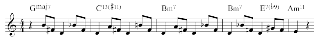 The Book Cooks Steve Lacy (Unfinished) The revolutionary conservatism of Steve Lacy’s “Prospectus” ![]() Steve Lacy Sextet: postcard included with Prospectus (hatART) © Horace There is still plenty of good music to be written in C major. Lacy’s Lines Steve Lacy’s tunes form one of the most unique bodies of work in jazz, and in contemporary music. Very clearly influenced by Thelonious Monk’s tunes, Lacy’s have a unique and immediately recognizable sound. Like Monk’s, they are angular, chromatic, strongly motivic and reflect a wry sense of humor. However, unlike Monk’s tunes, which still maintain roots in the language of bebop (no matter how tenuous) and follow song-like harmonic structures (often using blues and rhythm changes, but also featuring notable departures featuring strings of obscurely-related dominant seventh chords), Lacy’s tunes seem to be almost more closely derived from Monk’s solos, often taking a specific motivic idea and deeply, almost obsessively, examining it, turning it this way and that in the light, to examine particular melodic, harmonic and rhythmic facets. One element that he was particularly fascinated by was intervals. It may be that periodic long periods of unemployment made Lacy a world-class practicer, and he often used the word practitioner rather than musician to describe his role. One sometimes inadvertent result of sustained practicing is that the beauty of scales, arpeggios and long tones is revealed, and systematic patterns of intervals become melodies in themselves. Lacy made the creation of unpredictable patterns of intervals into a compositional (and improvising) language. Listen to bars 5-9 of his second solo chorus on Cole Porter’s “Easy To Love” on his Prestige recording Soprano Sax, one of his earliest recordings as a leader, and you can already see ‘evidence’ of his fascination with small changes in intervals and patterns. ![]() Fig. 1 bars 5-9 of the second chorus of Lacy’s solo on “Easy To Love”[1] Chromaticism in jazz Early jazz was largely diatonic, the most chromatic element being the injection of the blues scale over dominant seventh chords, with diatonic harmony favoured.[2] The voice-leading of the ‘Great American Songbook’, with its succession of ii V I chord sequences, built upon and expanded it, and the bebop era ear offered much more chromatic lines, featuring notes drawn from the upper extensions of the harmony (-9, +9, +11s etc.), over mostly standard harmonic structures. Later developments of post-bop, Wayne Shorter, modalism, brought both simpler and more complex harmony, and the free jazz of Ornette Coleman and late John Coltrane eventually abandoned the repetition of harmonic structures as a formal device. Like classical music, the history of jazz can be traced as a journey from simpler melodic, harmonic and rhythmic conventions, to ever-more complex ones, to the abandonment of these rules, to aleatory or improvised music worlds. Of course, this death march from tonality to atonality finished decades ago, and where to from there? Much of the subsequent forward motion has involved going back and more closely examining previously neglected side-paths or juxtapositions, and in a 1980 interview with Lee Jeske in Downbeat[3], Lacy referred to his music as ‘post-free’ or ‘poly-free’. Which brings us to “Prospectus.” Prospectus “Prospectus” was composed in 1978 in Paris and was first published in a collection of scores of the same name by Gunther Schuller’s Margun Music in 1987. While not mentioned in the published score, in Lacy’s hand-written chart it is dedicated to McCoy Tyner.[4] Like many of Lacy’s ‘songs’ it has a lyric, that was often sung by his creative and life partner Irene Aebi, based on a poem by French modernist poet Blaise Cendrars. Lacy explains in the introduction to the Margun edition (‘About The Music’) that, “The poet, Blaise Cendrars, found this text in a travel brochure in the ‘20s, gave it shape, and called it a poem. Years later I set it to music and now it’s a song ... the whole piece should be light and gay, off the ground.”[5] In Steve Futterman’s liner notes for the 1992 Novus recording Live at Sweet Basil, he says that the tune had been the band’s opening number for about 14 years. He quotes Lacy as saying, “It’s an invitation to a voyage, that’s why we start with it. It’s also a tune in C major, every note in it. It’s good for opening up, for tuning up, for breaking the ice, for letting the public hear our sound.”[6] The tune was played often by Lacy throughout his career in multitudinous formations: solo, various duos, quintet, sextet, both with and without the lyric. It was clearly a favorite. Prelude to the analysis The tune consists of a 36-bar melody, with an 8-bar introduction which is also played after the out-chorus as a coda. (There is a one-bar drum break separating the introduction from the in-chorus). The tune itself has no formal structural divisions, such as a 12-bar blues does, or a 32-bar AABA form common in jazz. There are rehearsal marks in the original Margun Music score, dividing the tune into five sections of 6, 5, 8, 8, and 9 bars respectively, and these are quite logical divisions based on the melodic development of the tune. However, none of them repeat, and this structure is not used as a form for improvisation. The end result is that “Prospectus” is a 36-bar jazz tune in which no single bar is ever repeated. And at no point in the tune does it even once depart from the diatonic key of C: that is to say, it can be played entirely on the white keys of the piano. However, there are a number of other ways in which the tune itself is both accessible and inviting. As mentioned, it is in a major key; it begins and ends on the tonic. While there are no chord changes per se, horizontally there are many moments of pretty conventional harmony implied, including ii V I’s, and I IV V’s. 