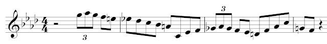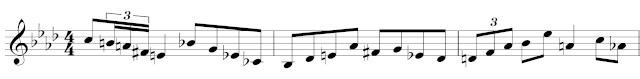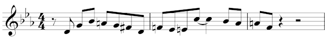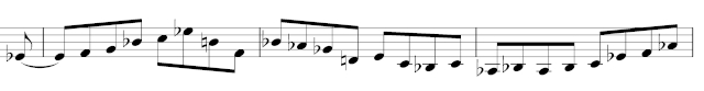 Analysis 1. Structure As mentioned earlier, the tune itself is constructed in 5 sections, as designated by rehearsal marks by Lacy, which I would further subdivide into 4 + 1. The tune as a whole is 36 bars long, in 4/4, consisting of sections of 6, 5, 8, 8 and 9 bars. Each of the first 4 sections can be divided into about 3 phrases, which can then be subject to further subdivision. The fifth and final section is sui generis, only in the fact that it consists of a single idea, which summarizes the content of the preceding four. Conventional jazz and popular tunes are usually structured in groups of 2, 4, and 8 bars. But the groups in “Prospectus” are casual, with phrases of different lengths, with each group separated from the next group by a short ‘rest’ or break of about a bar or so. ![]() Fig. 2 bars 1-6 of the main tune of “Prospectus” Usually in music a second phrase will be a response to a first, and then another two are introduced, often those two responding to the first two. But here there is a phrase, a reply, and then a reply to the reply. And then another group of three that repeat the process with another take on the same idea or group of ideas. This process is repeated four times, ending with the fifth section which can be viewed either as a climax or a denouement, in that it is simultaneously more focused (simplified) and yet more relentless in its arithmetical resolve. ![]() Fig. 3 bars 28-36 of “Prospectus” Once the improvising begins, though, unlike the mainstream approach of blowing over the form of the tune suggested by the melodic quality of the tune, the form is abandoned. The blowing consists of a series of solos, like most of Lacy’s band arrangements, which he indicates should be ‘in C major’ but it is clear that this is merely a suggestion.[11] However, the tune itself provides a rich lode of motifs with which to launch an improvisation. 2. Melodic Phrasing The tune is composed of a series of phrases: like a bop tune, it consists of a series of riff-like motifs, as opposed to a longer ‘melody’ like one would find in the popular tunes from the ‘30s and ‘40s that jazz musicians like to improvise on. However, with only a few exceptions, unlike a bop tune, it mostly eschews the tortuous twists and turns in direction (its diatonicism precludes that, with two exceptions); it mostly consists of rising and falling sequences of scales, or thirds and fourths (arpeggios). These are juxtaposed like a series of gestures, in comparison or contrast, most often as a repetition one diatonic step up or down. Of the first four sections, each section begins on the tonic or third of the key and all end on the perfect fifth (implied dominant) which leads us on to the next section. While there is no written harmonic accompaniment or structure, sequences of notes in arpeggios can imply harmony, and arpeggios abound, favouring Is, IVs and Vs, with jazz’s favorite devices, the circle of fifths and the ii V I, often to be found or implied. Oddly enough, the one exception to major and minor triads allowed in modal harmony, the vii diminished chord, is never to be found. This is quite surprising, given the favour that the tritone enjoys in the Lacy / Monk musical vocabulary. 3. Harmony Although there are no explicit chord changes written, the accompaniment being a series of the aforementioned clusters that have virtually no sense of functional harmonic progression, the melody implies harmony through its horizontal movement through a series of arpeggios and leading tones. In fact, it never stays still. ![]() Fig. 4 bars 21-25 of “Prospectus” As stated, each section (rehearsal mark) begins on the tonic chord (the tonic or the third) and ends on the fifth (dominant), which leaves us expecting the next episode. The one exception is the final section, which begins on the (implied) ii, leading us through a sequence that eventually ends with single note leading tones, resoundingly stating ii V I, an almost comically satisfying resolution (if an imperfect authentic cadence). However, it is modal harmony, though not what we normally think of as modal, being in the major rather than the minor key. ![]() Fig. 5 bars 28-36 of “Prospectus” 4. Directionality / Melodic Contours One of the most distinguishing characteristics of bebop – that separate it from the popular songs whose harmony is used to create contrafacts[13] – is its tortuously labyrinthian melodic lines, with chromaticism run riot. “Prospectus” contains none of these... almost. Instead it focuses on two directions: up and down. Almost every phrase in the tune travels uninterruptedly in one direction or the other, often responding to the previous phrase with affirmation or dissent. ![]() Fig. 6 bars 16-18 of “Prospectus” ![]() Fig. 7 bars 8-9 of “Prospectus” At only two moments (at bars 7 and 10) does the melody make the kind of mixed turns, to the extent permitted by its modal constraint, that we expect of a bebop tune. ![]() Fig. 8 bar 7 of “Prospectus” ![]() Fig. 9 bar 10 of “Prospectus” These are in a sense the dramatic high points of the tune, especially the second one. (Although note that they do not occur at the Golden Mean, unless you are reading the tune backwards). But like the murder of the heroine in Hitchcock’s Psycho, they occur surprisingly early in the structure. And like Psycho, “Prospectus” ends with a lengthy denouement (section E). What’s interesting about these up and down moves, usually either an arpeggio or a part of a scale, is how often they reoccur, but always recontextualised. As the essence of the tune is the limitation to a very small area, Lacy examines this melodic device with a microscope, like he examines the mode / scale. Compare this uninterrupted diatonicism and directionality to the shapes and chromaticism of bebop tunes like “Groovin’ High”[14] (Gillespie, 1945) or “Donna Lee”[15] (Parker, 1947),[16] Monk’s “Skippy”,[17]