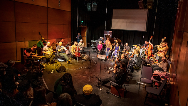 Page One: Glasgow Improvisers Orchestra: An Oddly Homely Avant Garde a column by ![]() Glasgow Improvisers Orchestra, © Brian Hartley Critic Stewart Smith was on point when he opined in a 2014 festival review for The Wire that Glasgow Improvisers Orchestra was extending a Scottish lineage of an “‘oddly homely avant garde.’” (In the UK, “homely” means cozy and comfortable like home, not unattractive as the word is commonly used in the US.) The phrase was artist Alec Finlay’s, who employed it to explain the common ground held in the early 1960s by poets Ian Hamilton Finlay (his father), Hamish Henderson, and Edwin Morgan. Countering the high modernism of the pre-war Scottish Renaissance they viewed as elitist, the poets articulated an aesthetic that accommodated Scottish folk and popular culture, as well as emergent international sensibilities, inciting what Morgan dubbed the Scottish Spring, a period of cultural reclamation that still ripples through new work of sundry disciplines in Scotland. This homeliness immediately cut through the soft alienation of live streams during the Orchestra’s GIOfest XIV in late November 2021. Gladness permeated the proceedings, their first in-person festival in two years. An improvising orchestra is usually a solemn, even somber lot, but there was ample grinning during the festival’s final set among GIO members, as well as MC Corey Mwamba, who curated an opening set of small groups to be heard on an early January episode of his BBC Radio 3 program, Freeness. A trio of women seated upstage – Cliona Cassidy, who sings with Scottish Opera when not improvising with GIO, the inimitable Maggie Nicols, and British-Afghani violinist-singer Faradena Afifi, who had previously only performed with GIO on their Zoom concerts during lockdown – barely kept from laughing heartily. Masks did not dampen the robust vocal approval of the full-house audience at Glasgow’s Centre for Contemporary Arts. It was beyond a homecoming; it was a celebration of the light at the end of the tunnel, though no one then knew the light was an oncoming train, Omicron.