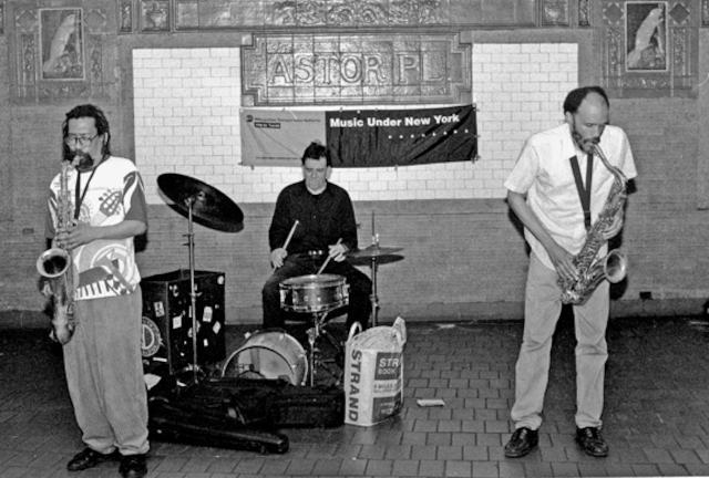 The Book Cooks The Williamsburg Avant-Garde: ![]() TEST: from left, Sabir Mateen, Tom Bruno, and Daniel Carter at Astor Place subway station, 1997 photo © Michael Wilderman Legitimizing Brooklyn: Jump Arts Festivals In 1999, however, conscious attempts were made to bring the East Village and Williamsburg artist communities together, in the form of a collective called Jump Arts, led by recent New School graduates bassist Tom Abbs and drummer David Brandt. The explicit goal was to get musicians from the East Village, some of whom had lived and worked there for decades without ever playing in Brooklyn, to attend or perform at events in Williamsburg. Jump Arts also organized events in Manhattan that featured musicians from both communities and at times organized tours for these musicians outside of New York City. Some of the demand for these connections came as the Knitting Factory was beginning to become less the center of the scene, first moving to Leonard Street on the Lower East Side in 2000 and then closing altogether two years later. Tonic would soon emerge as the new center, but for a time the community was searching for other venues and specifically for opportunities in Williamsburg. Jump Arts put on a series of twelve festivals, drawing the downtown scene and the emerging Williamsburg scene together in 1999–2003. Abbs specifically aimed to bridge the two scenes, incorporating Gold Sparkle Band into much of what was happening in the downtown scene, and fuse them in Williamsburg. Abbs sensed that “there was nothing for emerging artists, very few opportunities for the up-and-coming generation to get gigs to play their own music, so I formed the Jump Arts collective nonprofit.” One of the earliest events, Jump over the River: Liberation Music Festival, took place on July 2, 1999. The bill featured a number of bands, including the Triple Threat Sextet, which was essentially an expanded Gold Sparkle Band lineup with Abbs and others. The same evening, multi-instrumentalist Daniel Carter (b. 1945) and Williamsburg-based drummer Randy Peterson played in their first-ever duo performance. Carter had been a pivotal figure on the downtown scene since the 1970s. Peterson, a close associate of renowned saxophonist Joe Maneri (1927–2004), has remained more of an underground figure, despite appearing on a number of records. Carter’s involvement, though it was not his first time playing in Williamsburg, sparked a string of innovative performances by the multi-instrumentalist at free103point9 in the years that followed.